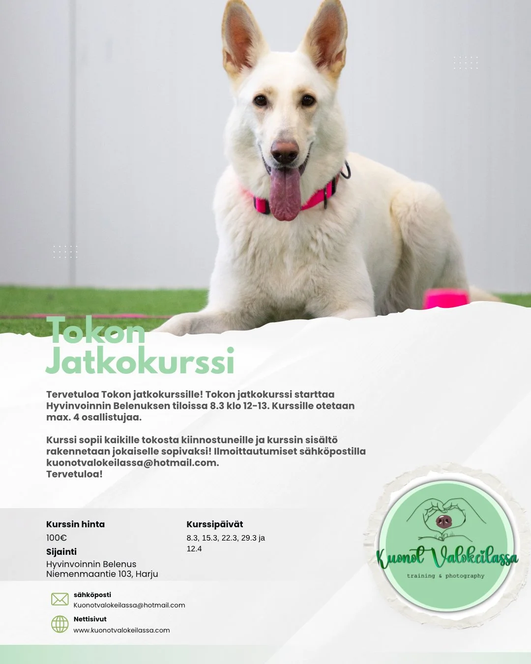 Olen Elisa! Aktiivinen koiraharrastaja ja eläintenkouluttaja At- opiskelija. Yritykseni Kuonot Valokeilassa tarjoaa treenivalmennuksia sekä valokuvauspalveluita. Olen treenannut ja kisannut Tokossa valkoisenpaimenkoirani kanssa ja Toko on aina ollut oma suosikkilajini. Toimin myös KSSK:lla kouluttajana ja Tokovastaavana jonkin aikaa ennen omaan yritykseen siirtymistä. Lisäksi harrastan omien koirieni kanssa Mondioringia, hakua, jälkeä ja vetolajeja. Kouluttajan haluan, että asiakkaat saavat laajan ymmärryksen tokosta lajina, ymmärtävät kokonaisuuksia ja miten liikkeet rakennetaan suoritusvarmoiksi. Muita minulle tärkeitä teemoja ovat motivaatio, koiran ja ohjaajan välinen suhde . TOKO:ssa vain mielikuvitus on rajana liikkeitä rakentaessa ja treenaaminen on oikeasti super hauskaa!
